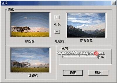 在“特效處理”中可給照片加入各種特殊效果,如圖片合成、美術效果、狀態效果、透視效果和將BMP圖象轉換為文本等,例如要將圖片合成,可打開兩幅照片,然后單擊“圖片合成”子菜單,將彈出合成預覽框。預覽框中提供了原圖象和參考合成圖象,以及合成后圖象的預覽,可通過調節滑桿來調節原圖象在合成后圖象中所占的比例,便捷好用。