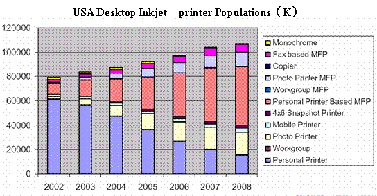 2004年11月15日InfoTrends研究機(jī)構(gòu)發(fā)表的市場(chǎng)調(diào)查結(jié)果表明,2003年美國(guó)共安裝了超過8300萬臺(tái)桌面噴墨打印設(shè)備,使得噴墨成為桌面打印的主要輸出方式。其中,照片噴墨打印機(jī)裝機(jī)量482萬臺(tái),比02年增加39%。在這里所謂照片打印機(jī)(Photo Printer),是指同時(shí)具備照片級(jí)彩色輸出性能,數(shù)碼相機(jī)存儲(chǔ)卡插槽,照片級(jí)墨盒三種典型特征的打印機(jī)。多功能一體機(jī)(MFP, multifunctional printers or imaging devices)是將打印,掃描,傳真,復(fù)印等功能復(fù)合一體的設(shè)備,其增長(zhǎng)的速度也非常快,2003年裝機(jī)量1585萬臺(tái),比02年的1085萬臺(tái)增長(zhǎng)46%。其中部分MFP除打印,掃描,傳真功能外,還具備照片彩色打印功能,這種增長(zhǎng)同時(shí)也大大提高了特殊打印介質(zhì)(specialty media)的需求。Infotrends預(yù)期到08年,照片噴墨打印機(jī)的年裝機(jī)量可達(dá)1890萬臺(tái),占總裝機(jī)量的18%,普通MFP高達(dá)4800萬臺(tái),占總裝機(jī)量的45%,帶照片彩色打印功能的MFP1160萬臺(tái),占總裝機(jī)量的11%。而普通型個(gè)人噴墨打印機(jī)(Personal Pinter)的裝機(jī)量呈逐年下降趨勢(shì),數(shù)據(jù)表明2003年比02年下降了4.3%,普通個(gè)人噴墨打印機(jī)所占比例也逐年減少,預(yù)期08年僅占15%以下。2003-2008年間,噴墨打印機(jī)的總裝機(jī)量CAGR 為5%。