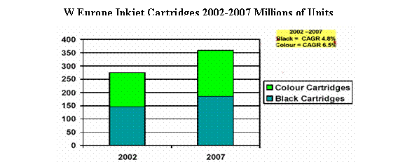 CAP Ventures 2003年對(duì)西歐市場(chǎng)的調(diào)查結(jié)果顯示,2002-2007年間,預(yù)期彩色噴墨墨盒的銷售數(shù)量年遞增率將達(dá)6.5%, 從2002年的1.26億個(gè)增加到2007年的1.72億個(gè)。而黑墨墨盒的年遞增率4.8%, 略低于彩墨增長(zhǎng)率。銷售額的年遞增率則為黑墨 4.1%,彩墨5.7%。2002年彩墨墨盒的銷售額約40億美元,2007年可望達(dá)到52億美元。