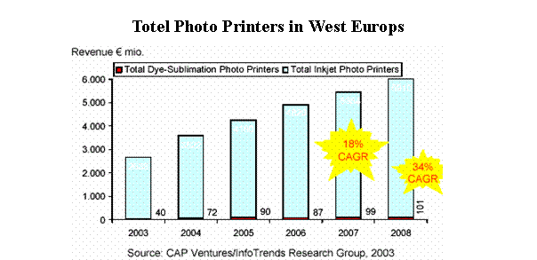 Infotrends /CAP Ventures 2004年2月的調(diào)查顯示, 2003年整個(gè)西歐照片噴墨打印機(jī)的市場(chǎng)銷售額為26.33億歐元,而熱升華打印機(jī)的銷售額僅0.40億歐元,2008年照片噴墨打印機(jī)的市場(chǎng)銷售額可望達(dá)到59.10億歐元,每年遞增率18%,熱升華1.01億歐元,由于基數(shù)小每年遞增率達(dá)34%。