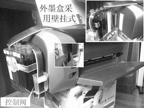 外墨盒放置高度一般和打印機放在同一平面,要求墨水液面略低于打印機噴嘴(千萬不能高于打印機噴嘴過多,否則壓力過大,墨水會通過打印頭流進打印機內部廢墨倉里),故一般外墨盒做得寬大但是不高。外墨盒在使用中隨著墨水消耗液面下降,因此及時調高放置高度是必要的,否則就要及時補充墨水。為此,有的連續供墨采用了分色調壓法,在外墨盒的各墨盒下面安裝定位比較精確的彈簧,墨水多就重,彈簧壓得比較下去;而墨水少,墨盒就被彈簧頂高,實際上就是根據各色墨水量調節每色壓力。而有的連續供墨則采用通氣孔一直延伸到墨盒底部作為平衡倉,利用大氣壓力原理使各色墨盒中無論剩余墨水多少其出墨口壓力都基本一致,這種方法簡單實用被很多廠家采用。利用大氣壓力原理的外墨盒不受墨水多少的影響,所以就可以“減肥瘦身”增加高度,這樣就可以直接用魔術貼將外墨盒粘貼在打印機外殼上,方便搬動。有的在外墨盒上裝有控制排管中墨水流量的控制閥(圖3)。為了外墨盒更加美觀,一些廠家將各色墨盒再統一裝入一個精美的大墨盒內,也很時尚(圖4)。