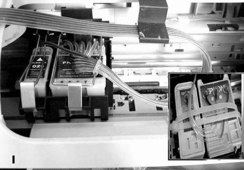 內墨盒上面插有排管,這樣就造成原有墨車蓋子無法蓋上,最早的辦法是將墨盒捆扎在墨車上,或者將墨車蓋子取下用鐵絲制作的架子代替,以便固定內墨盒(圖6)。而目前有幾個比較好的辦法: