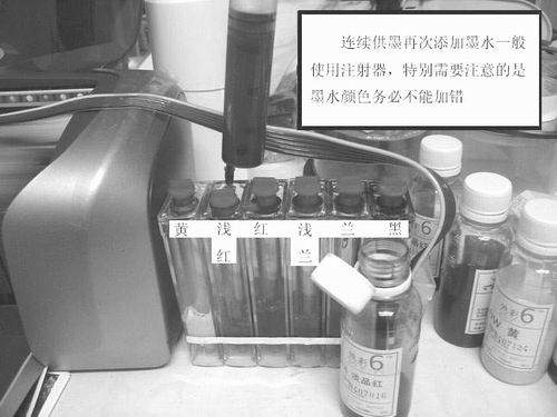 3.打印機使用連續供墨系統以后的日常保養工作不可忽視以下幾點:①打印機擺放位置不能被日光直接照射,同樣,外墨盒盡量不要長期被紫外線照射,以免外墨盒墨水保存時間縮短,如果受使用條件的限制,可以將外墨盒做遮光處理或者選用外墨盒有防紫外線盒子的連續供墨。②外墨盒上都有通氣孔,打印機的使用環境就需要注意防塵工作。③打印機不能長期不使用。噴頭在打印中是否有斷線,與氣候、環境、墨水質量、自身狀況等都有關系,最好每半個月至少使用1次,氣候特別干燥的地區每周至少使用1次,如確實無打印任務,可以打開打印機電源后,打印一張噴嘴檢查圖以便確定噴嘴狀況。④外墨盒再次添加墨水方法按照說明書操作即可,需要注意的是打印機外墨盒的墨水最好不要使用一點就馬上添加,墨水存放有一個保質期,每色使用到一定極限再添加為好;添加墨水的時候也要注意不要加得過滿,更不能添加錯顏色(圖14)。⑤不同牌子的墨水不要混用,如果要換其他牌子墨水,應將外墨盒中的墨水抽干后再更換,顏料墨水和染料墨水之間需要互換,應當先將整個連續供墨系統的墨水都抽干凈并進行清洗。