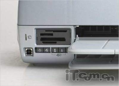 對于照片打印機來說,最重要就是它一般都設計內置了數據讀卡單元,能夠在不連接計算機的情況下,可直接讀取數碼相機存儲卡中的照片數據并進行打印。可以從圖中看到,在Photosmart 7268前面板上提供的一組存儲卡插槽,這一組存儲卡插槽,能夠直接讀取CompactFlash、SmartMedia、Secure Digital、多媒體卡以及記憶棒等主流類型的存儲介質。另外在插槽旁邊也提供了提供了打印10×15cm照片和打印照片拼頁的按鍵,接讀取數碼相機存儲卡中的照片數據并進行打印。